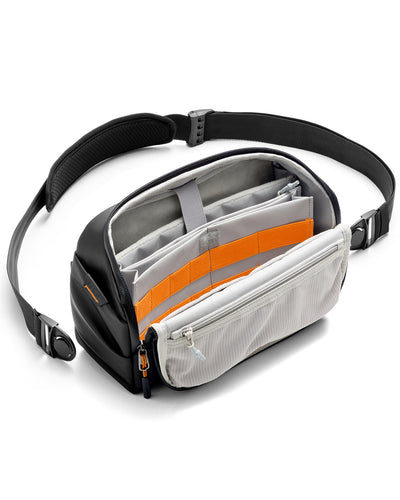 - Mobile Workstation:Featuring a 135° opening design and a half-flap foldable magnetic cover, this sling bag provides clear visibility of your items. Whether in the office or a café, simply unzip and unfold the magnetic cover to quickly transform it into a convenient workspace, allowing you to work efficiently in any environment.
